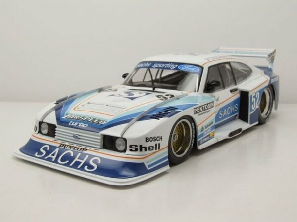 Der Ford Capri Turbo Gr.5 war kein gewöhnlicher Tourenwagen. Entwickelt für die anspruchsvolle Gruppe 5-Regularien, verkörperte er die Spitze des damaligen Rennwagenbaus. Mit seinem markanten Turbo-Motor, der eine immense Leistung entfesselte, und seiner aggressiven Aerodynamik dominierte er die Rennstrecken. Hans-Joachim Stuck, einer der bekanntesten deutschen Rennfahrer, pilotierte den Capri mit der Startnummer 52, gesponsert von Sachs, und begeisterte die Fans mit seinem Fahrstil.